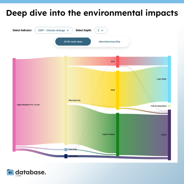 La nouvelle interface simplifie la sélection des modèles et fournit des informations claires et visuelles grâce à des diagrammes de Sankey colorés. Les utilisateurs naviguent plus facilement et identifient rapidement les principaux impacts environnementaux.